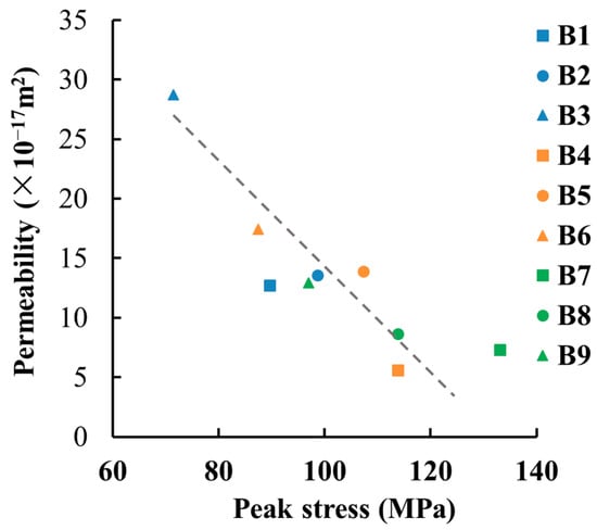 The peak parameters of sandstone, including deformation and permeability parameters, at the peak stress state in Stage III, are listed in Table 2. To intuitively summarize the corresponding effects of initial confining pressure and pore pressure, Figure 7 is drawn by using the data in Table 2. Under the same initial confining pressure, the peak stress of sandstone reduces with the increase in pore pressure, while the peak stress of sandstone increases with the incremental confining pressure under the same pore pressure. The absolute value of both the axial strain and the radial strain increases with the incremental confining pressure. Under the same confining pressure conditions, the volumetric strain at the peak stress state gradually decreases due to the increase in pore pressure. Most sandstone samples still maintain compression at the peak stress state, except for samples B5 and B8, which was significantly different from the coal samples [26]. The mineral composition and pore–fracture structure are the main reasons for this distinction. The sandstone is mainly composed of brittle minerals and is dense, with fewer pores and microcracks resulting in it being hard to deform. Conversely, the coal is composed of ductile minerals and has more microcracks and cleats, so it becomes more easily deformed at low confining stress. Note that the individual difference in samples leads to a slight deviation between the test results and the overall test law.
