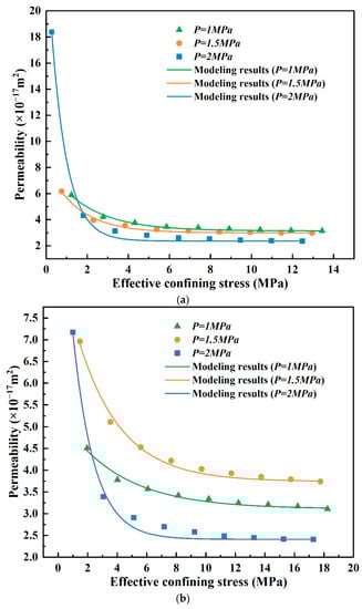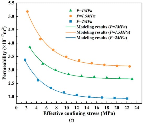 Permeability of the sandstone samples under different effective confining stresses and pore pressures, and modeling results from the proposed model in this study ((a–c) are the initial confining pressure of 15 MPa, 20 MPa, and 25 MPa, respectively).