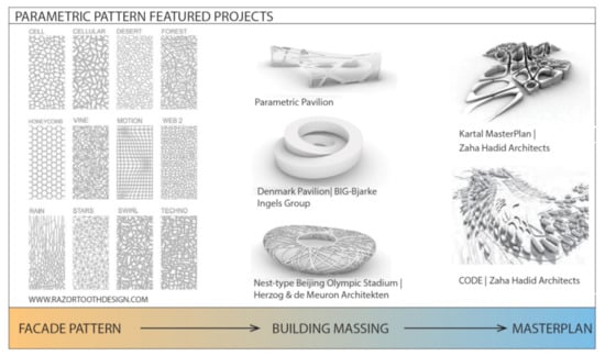 During the design process, form generation is controlled by the modeling parameters. Generative design uses a bottom-up paradigm and parameter control to achieve the design target or solve design problems efficiently [7]. One of the main advantages of parametric models is that they can be easily transformed, resulting in variations of different configurations with the same geometric elements [8]. Design of different scales, from building components such as the façade, building massing, and urban-scale clusters, can be achieved through parametric tools (Figure 2). The overall model can be conceptualized as a group of typical finite instances, each instance determined by the specific values of the model-independent variables, increasing control over building representation management. A large number of instances can be filtered based on the results of environmental performance simulation, and the survivors can then be subjected to optimization, thus providing convenient integration of building performance simulation into the architectural design stage.