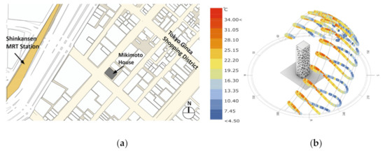 Mikimoto Ginza 2 location (a) and sun path visualization showing the relative dry bulb temperature (b).