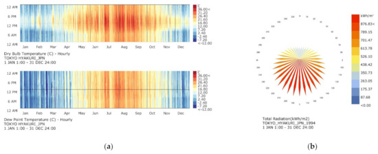 Tokyo climate variables: (a) Tokyo dry bulb and dew point temperature; (b) Tokyo total radiation of whole year.