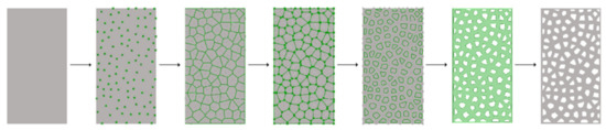 To build a façade model, the first step was to construct the same façade with the same height and width (Figure 7). Second, multiple points were populated in the region of the rectangle. The number of points was set as a parameter; it can also be understood as the number of openings. Third, modeling control extended from a point to the range of the Voronoi radius to generate planar Voronoi polygons for a collection of points. The Voronoi polygons were deformed into closed curves, and each shrank on a random scale ranging from 0.2 to 0.7. At this point, the parametric surface was the same as the case study façade. As two façades are blocked by the surroundings, only two surfaces have the Voronoi pattern. The building model was rotated at the same angle to match the actual orientation, with the main entrance facing southwest.