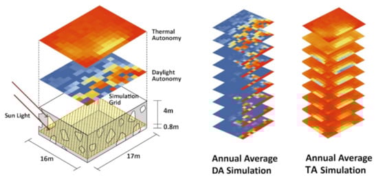 Enhancing daylighting hours and improving thermal comfort were selected as two important objectives for optimization of the façade performance. Considering Tokyo’s local climate, less solar radiation and more daylighting are in conflict, especially in summer [37]. Daylight autonomy (DA) and thermal autonomy (TA) were used as metrics in daylight and thermal comfort simulations in Ladybug and Honeybee [38,39]. Ladybug and Honeybee are based on the Grasshopper platform, which integrates building performance simulation and visualization with parametric design, using engines such as Energy-Plus and Open Studio for energy simulation [40] and Radiance and Daysim for daylighting analysis [41,42]. Table 1 shows the parameter settings.