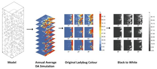 In the simulation process, 100 sample training pairs were generated from the parametric model, which includes façade pattern, DA, and TA. For the simulation grid setting, each simulation surface was 0.8 m above the floor [43]. There were 272 measuring meshes on one surface, with a grid size of 1 m × 1 m. In the center of each grid mesh, there was one measuring point to obtain the simulation result, a total of 272 points on one floor. The DA and TA were simulated for each floor; the total simulation visualization of nine floors was arranged into one image for preparation of the training datasets for the machine learning model (Figure 8).
