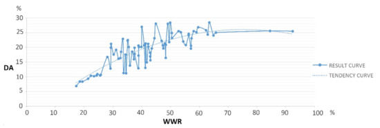 The original case pattern was simulated first to evaluate the current DA performance (Figure 9). The DA of each floor is different due to different dimensions and positions of the openings on each floor. Each point represents the average DA value of nine floors with a specific WWR, as shown in Figure 10. There is an overall relationship between DA and WWR; when an opening and the WWR are larger, the DA tends to increase.