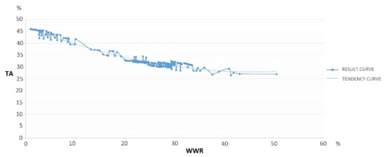 There is a clear decreasing trend of TA as WWR increases, as shown in Figure 12. For this case, large openings on the façade generally indicate more shortwave radiation entering and possibly greater cooling demand in summer, and heat loss to the outdoors resulting in greater heating demand in winter. Thus, a lower WWR on the façade is beneficial for increasing thermal comfort; DA and TA have different demands for WWR.