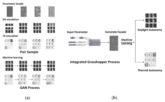 GAN and Grasshopper process: (a) dataset preparation for training the machine learning model; (b) output of machine learning model.