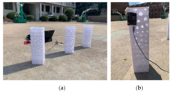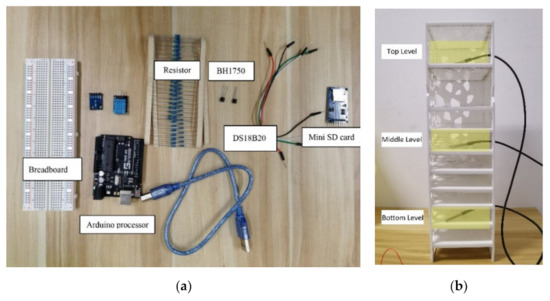 The three models were placed outside without any shade, allowing natural sunlight to reach the models. The light and temperature sensors were placed in the middle of the top, middle, and bottom levels (Figure 18b). Measurements were conducted for three days, in three sets from 9–10 am, 12–1 pm, and 3–4 pm, covering the majority of daytime occupancy.