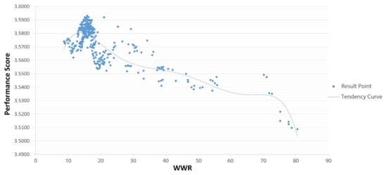 With changes in the opening shape, size, and position of the windows on the façade, the WWR changed as well. The performance score tended to first increase and then decrease as the WWR increased, as shown in Figure 19. The tendency curve represents the overall trend of the change in performance score. The peak of the performance score was approximately 3.594 with a WWR of 15%. The best performance was achieved with a WWR of 10–20% in this study.
