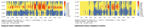 The annual comfort status was compared for the optimized scheme and the original scheme, as shown in Figure 21. The optimized model has more yellow areas (corresponding to comfort status) and fewer red areas (corresponding to hot status) than the original model, especially from October to April. Thus, the optimized façade system can reduce excess sunlight entering the interior, resulting in more comfortable space in the optimized result.