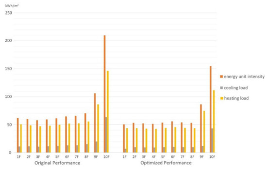 Energy consumption was determined to compare the year-round energy balance of different schemes (Figure 22). For the best-optimized scheme, there were fewer heating needs from November to April, and fewer cooling needs in summer. Generally, less energy is needed for light and thermal environment conditions. From the simulated energy data from different floors (Figure 23), the annual EUI (energy unit intensity) is lower than in the original scenario, especially for the ninth floor and the top floor. The optimized model reduces the average EUI from 115 to 65 KW/m2. Both the wall and the roof can receive heat radiated from the sun to the outer envelope and transfer the heat into the room, resulting in a large heat loss in winter and a heat gain in summer. The optimized model has fewer openings than the original design, avoiding too much heat transfer while ensuring sufficient daylighting.
