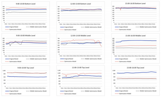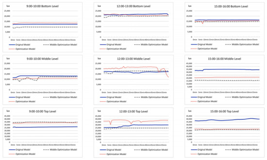The original model received high light intensity, as shown in Figure 24. The two optimized models have higher illuminance than the original model when light is not sufficient in the morning, and lower illuminance when light is strong in the afternoon. Especially the optimized model has average 1000 lux higher than the original model in the morning, which improves the visual interior environment. The light environment is relatively stable in the two optimized models, avoiding strong exposure from the west side in the afternoon. The optimized model windows are generally smaller than those in the original model, which are almost one story high.
