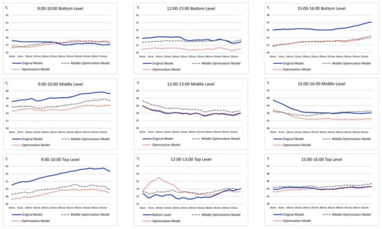 Figure 25 shows that the two optimized models have a lower temperature than the original model in summer, especially the model with the highest performance score. Although all measured data are higher than the common measured data of actual buildings due to the lack of insulation material in the openings in the physical models, the relative relationship indicated by comparing the three test models verifies the optimization.