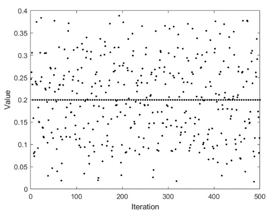 In WOA, in order to synchronously carry out the process of shrinking and spiraling, the original algorithm sets the probability of selecting both behaviors at 50%. A random number between [0, 1] generated by rand function is compared with the probability threshold, and then the choice is made. The method of setting equal probability thresholds in the original algorithm lacks consideration of changes in population diversity. An adaptive parameter is introduced to replace the original probability threshold. The adaptive probability threshold can be changed in the interval [0, 1] with the iteration of the algorithm, so that the whales have a greater probability to choose a prey strategy suitable for the current group in different periods, thereby coordinating the global search and local development capabilities of the algorithm. The mathematical model of the adaptive probability is shown in Equations (15) and (16), where in Equation (15) is a random number generated by using the Circle chaotic map. Figure 2 shows the change of adaptive probability threshold with the number of iterations.