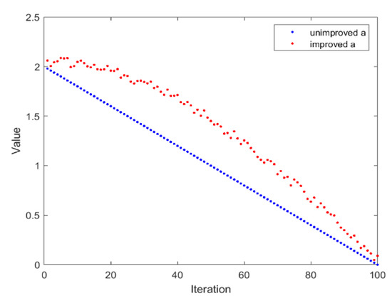 Figure 3 shows the change in the convergence factor a as the number of iterations increases. It can be seen that compared with the original change method, the improved convergence factor achieves a larger value in the early stage of the iteration, and the value fluctuates within a certain range, which improves the global search ability and enhances randomness.