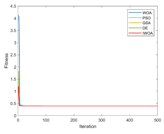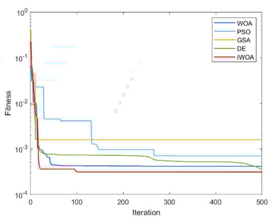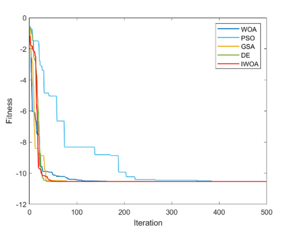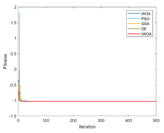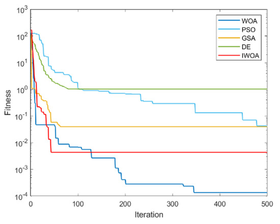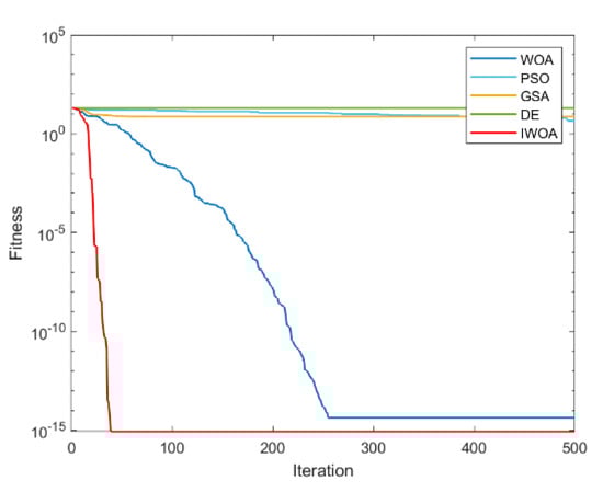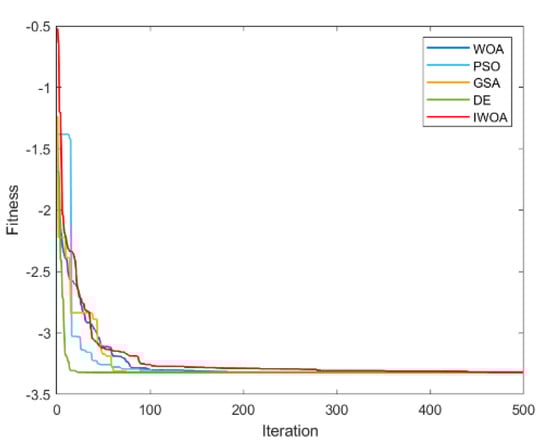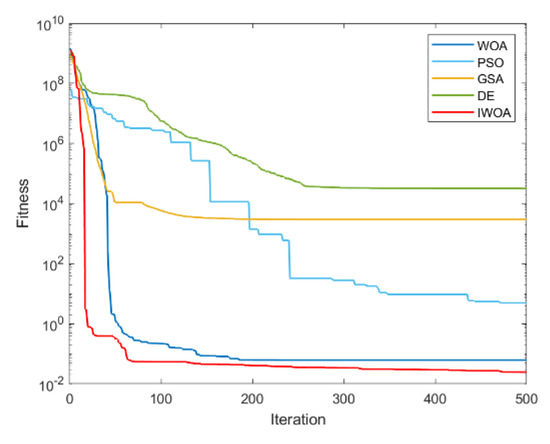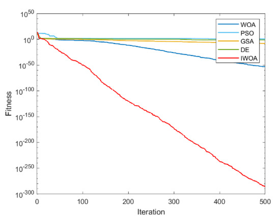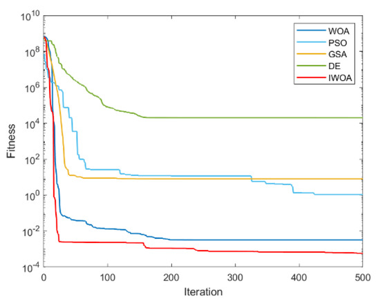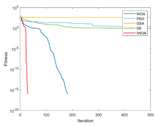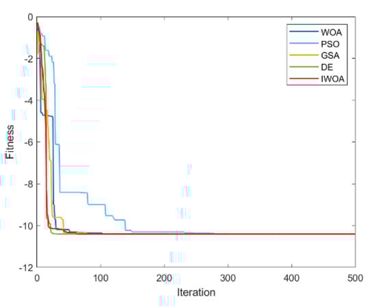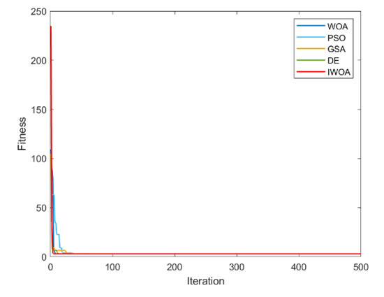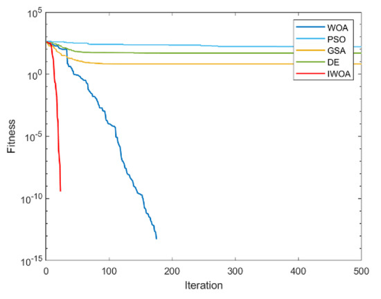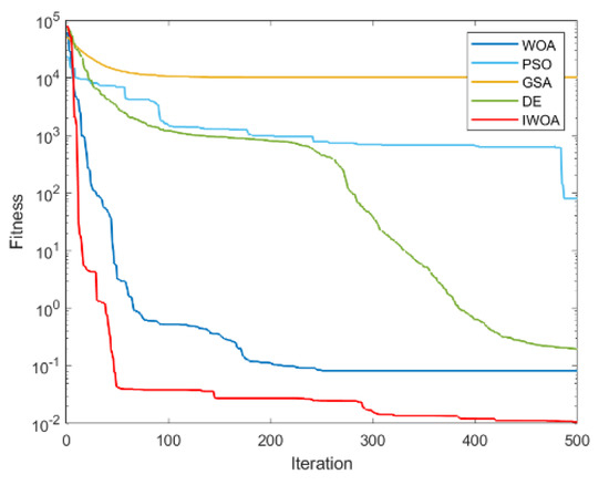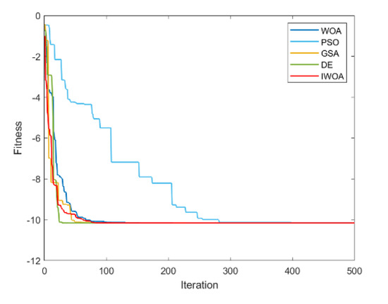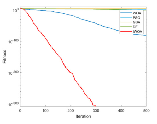 It can be seen from Table 2 and Table 3 that IWOA has the best performance on the 10 benchmark functions. Among them, the theoretical optimal value is obtained when solving 8 functions (F1, F5, F11, F16, F17, F18, F22, F23). Among the 18 tested functions, IWOA ranks the worst only when solving F18. The number of functions that the other four algorithms obtain the optimal solution among the 18 test functions is: 2, 1, 1, and 3. As can be seen from Table 3, IWOA ranks first, followed by DE, GSA, PSO, and WOA. In the unimodal function test, IWOA performs significantly better than the other four algorithms when solving F1 and F2. When solving F3 and F4, although the optimization effect of IWOA is not the best, the ranking of IWOA is in the middle position. In the multimodal function test, IWOA outperformed the other four algorithms when solving F5–F7. When solving F8 and F9, IWOA does not work well, but both mean and standard deviation are better than WOA. When solving the fixed-dimensional multimodal functions F10–F13, F17, and F18, the solution effect of IWOA is obviously better than the other algorithms. When solving F14, the effect of IWOA is slightly weaker than that of PSO and GSA. When solving F15, IWOA is slightly weaker than GSA, but better than other algorithms. When solving F16, IWOA ranks second. Figure 6, Figure 7, Figure 8, Figure 9, Figure 10, Figure 11, Figure 12, Figure 13, Figure 14, Figure 15, Figure 16, Figure 17, Figure 18, Figure 19, Figure 20, Figure 21, Figure 22 and Figure 23 show the convergence of five algorithms on 18 test functions.