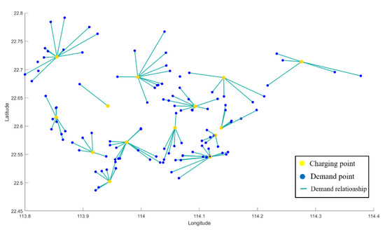 In Equations (29)–(32), is the set of all demand points and is the charging demand point. When the value of is 1, it means that the demand of charging demand point is provided by charging service station , otherwise it is 0. When the value of is 1, it means that point is selected as the charging service station.