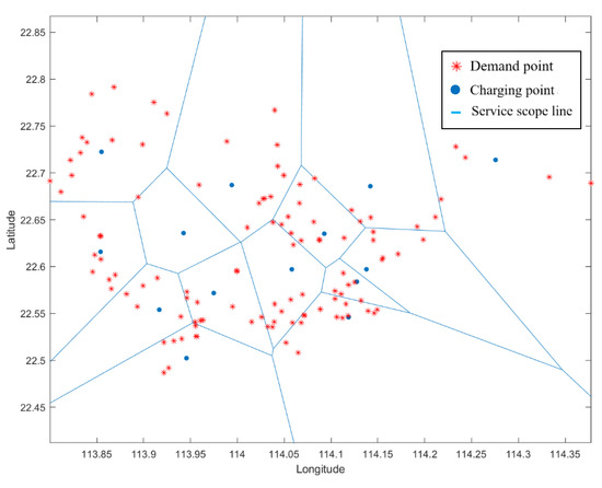 Using a Voronoi diagram to divide the service scope of charging stations.