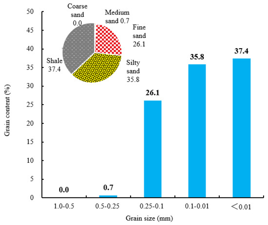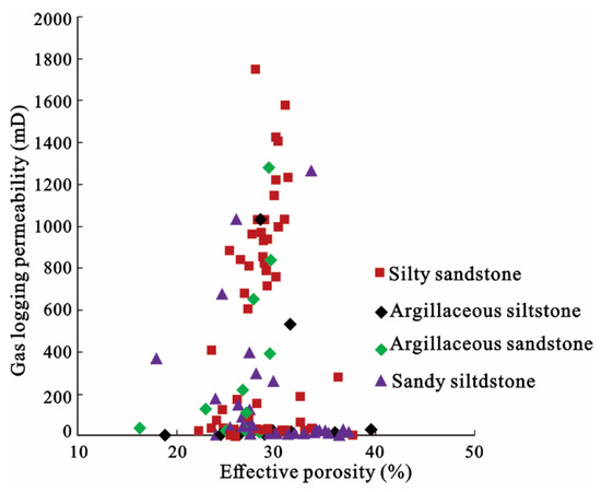 The Middle Jurassic P Formation, the major producing system in Kalamkas Oilfield, is a layered, unsaturated, stratigraphically-unconformable reservoir with a gas cap and edge water. The P Formation pay zones are mainly composed of fine sandstone and siltstone, with a high shale content (20–35%). The core porosity experiments show that the reservoir has a medium-high porosity (avg. 28.6%) and a medium-high permeability (avg. 357.4 mD), and it is a kind of clastic rock reservoir common in Central Asia. The P Formation was initially developed by water injection in 1980. Currently, it is in the stage of development with a high water cut (93%), with 20.4% of geological reserves recovered, and daily oil production of 0.5–55 t, and a water cut of 0–98% for new wells, indicating greatly different water flooding degrees in the reservoir. A large number of core analysis and production data show that the P Formation sandstone reservoir in Kalamkas Oilfield is complex and diverse in pore structure, obviously different in reservoir quality [24,25], and very strong in heterogeneity. The core grain size analysis reveals (Figure 1) that the reservoir rocks contain a generally high content of fine particles, of which, 37.4% exhibit the components with grain size less than 0.01 mm, and which are mainly clay mineral particles, except for a small part of fine silts. According to the porosity–permeability relationship, the lithology and pore structure are complex, and the correlation between porosity and permeability is very weak (Figure 2). After long-term water flooding, fine particles, such as clay minerals, block the port throats, thereby aggravating the reservoir heterogeneity, so the water flooding law is very complex [26,27]. With the further development, the quantitative research on water-flooded zone is particularly important.