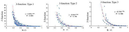 When logging data are used to identify water-flooded zones, reservoir classification is an effective way to improve the identification accuracy of water-flooded zones in heterogeneous reservoirs. Reasonable reservoir classification is particularly critical in the interpretation of water-flooded zones in reservoirs with no obvious porosity–permeability relationship. Many scholars classify reservoirs according to the principle that the same flow units have similar physical properties and flow capacity. Wang et al. [14] classified the reservoirs with permeability as the primary parameter and porosity as the second parameter. Yang et al. [10] proposed a multivariate evaluation method combining porosity and permeability with microscopic parameters. Gunter et al. [13] classified the reservoirs according to the concept of flow unit. Essentially, these methods are based on the function of porosity and permeability, but are limited for reservoirs with a very unclear porosity–permeability relationship. According to the conventional core analysis, capillary pressure curve shape, logging responses, and analysis of logging facies and lithofacies, the capillary pressure curves of Kalamkas Oilfield are divided into three groups (Figure 5): Type 1, Type 2, and Type 3. Type 1 capillary pressure curves are the longest in the middle gentle segment and the lowest in position, and represent the reservoirs with the best sorting and the largest throat radius, being the reservoirs with the best physical properties. Type 2 capillary pressure curves have a slightly shorter middle gentle segment and higher position than Type 1, and represent the reservoirs with moderate physical properties. Type 3 capillary pressure curves have the shortest and highest gentle segment, and represent the reservoirs with the worst physical properties. Accordingly, the average value of each group of capillary pressure curves (J-function) was obtained. Figure 6 shows the J-function of the P Formation in Kalamkas Oilfield. It can be seen that the data points are concentrated, indicating that the grouping of capillary pressure curves is reasonable.