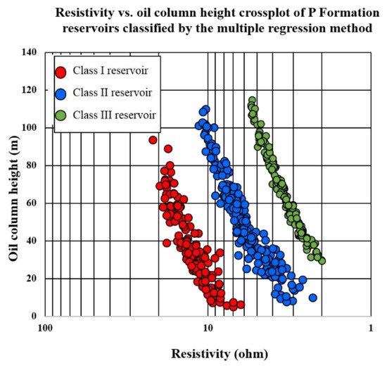 Crossplots of resistivity and oil column height of P Formation reservoirs.