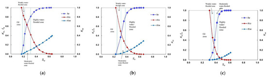 Oil–water relative permeability of classified reservoirs. (a) Class I reservoirs, (b) Class II reservoirs, and (c) Class III reservoirs.