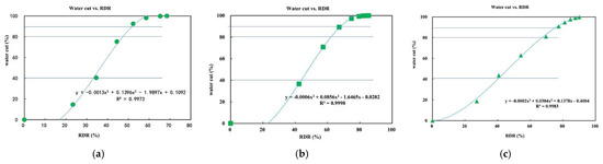 As classified, the reservoirs with the porosity ∅ < 23 are Class III reservoirs, the reservoir with the porosity of 23 < ∅ < 27 is a Class II reservoir, and the reservoir with the porosity ∅ > 27 is a Class I reservoir. The relative permeability test was carried out for each class of reservoirs (Figure 9). In Figure 9a, the oil–water two-phase flow area is wide, the endpoint permeability is high, and the irreducible water saturation is low, indicative of reservoirs with large and well-connected pores. In Figure 9b, the oil–water two-phase flow area is narrower, the endpoint permeability is lower, and the irreducible water saturation is higher than that in Figure 9a, indicative of reservoirs with relatively poor physical properties, and small but moderately-connected pores. In Figure 9c, the oil–water two-phase flow area is narrow and the endpoint permeability is low, indicative of sandstone reservoirs with high shale content and poor connectivity. According to the Specification for Logging Data Processing and Interpreting of Water-flooded Zone (SY/T 6178-2017) [31], the water cut of the water-flooded zone can be divided into: fw ≤ 10% (clastic rocks), 10% < fw ≤ 40% (low level), 40% < fw ≤ 80% (moderate level), 80% < fw < 90% (high level), and fw ≥ 90% (ultra-high level); accordingly, by the water-flooding intensity, each class of reservoir can be divided into non-water-flooded (oil zone), weakly water-flooded, moderately water-flooded, and highly water-flooded. Based on the relative permeability test, the relationship between water cut and water saturation is established for each class of reservoirs, and the relationship between water saturation and resistivity (or resistivity decline rate or RDR) under the experimental conditions is calculated from the Archie formula. Therefore, the relational expression between water cut and RDR for each class of reservoirs can be obtained (Figure 10a–c), and then the quantitative evaluation model of water-flooded zones can be built. According to Formulas (2)–(5), the initial resistivity can be determined from the basic logging parameters. Then, the difference between the initial resistivity and the measured resistivity after water flooding is obtained, and the difference (i.e., RDR) is brought into the relational expression between RDR and water cut (Figure 10), so as to realize the quantitative evaluation of water-flooded zones. In Class I reservoirs, those with RDR > 80% are extremely highly water-flooded zones, those with 69% < RDR < 80% are highly water-flooded zones, those with 41% < RDR < 60% are moderately water-flooded zones, and those with RDR < 41% are weakly water-flooded or oil zones. In Class II reservoirs, those with RDR > 68% are extremely highly water-flooded zones, those with 62% < RDR < 68% are highly water-flooded zones, those with 43% < RDR < 62% are moderately water-flooded zones, and those with RDR < 43% are weakly water-flooded or oil zones. In Class III reservoirs, those with RDR > 57% are extremely highly water-flooded zones, those with 49% < RDR < 57% are highly water-flooded zones, those with 37% < RDR < 49% are moderately water-flooded zones, and those with RDR < 37% are weakly water-flooded or oil zones.