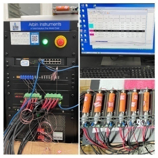 After establishing the electric-thermal coupling model of the lithium-ion battery, according to the “FreedomCAR Hybrid Electric Vehicle Battery Testing Manual”, the hybrid pulse power characteristic (HPPC) test was carried out to identify the battery parameters of the NCR18650B ternary lithium-ion battery, and a charging experiment was designed to verify the reliability of the model. The experimental equipment used was the Arbin BT-ML-30V/10A battery tester, as shown in Figure 2. The main purpose of the charging experiment was to compare the actual battery terminal voltage with the model output voltage, as well as the actual battery temperature and the model output battery temperature, to verify the reliability of the model.