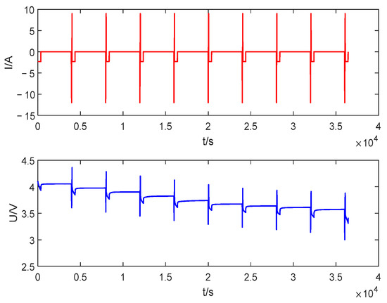 In this paper, the HPPC test experiment shown in Figure 3 was used to identify the six parameters of ohmic internal resistance , polarization resistance and , polarization capacitance and , and open circuit voltage in the second-order RC equivalent circuit model. The HPPC test was composed of the repeated charge and discharge pulses. A 1C constant current discharge step was performed after a charge-discharge pulse was performed, and the capacity released during the pulse process was 10% DOD in total. Additionally, the C discharge was followed by a 1 h rest to allow the battery to return to electrochemical and thermal equilibrium before proceeding to the next cycle.
