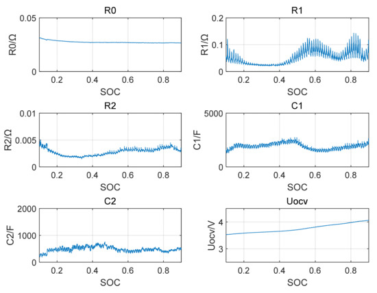 Since the parameters are different in different SOC states, it is necessary to repeat the parameter identification steps at different SOC points, and the identification results of each parameter in the second-order RC equivalent circuit model were obtained as shown in Figure 4 below. The obtained results were fitted to function curves of SOC and various parameters in the circuit model and then applied to the lithium-ion battery model.