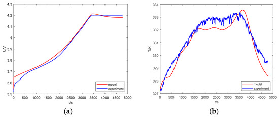 After the model parameter identification results were obtained, the battery was charged with a CC-CV charging method with a current of 2.4 A, and the simulation results of voltage and temperature were compared with the actual experimental results, which verifies the rationality of the electric-thermal coupling model established in Section 2.2 of this paper. Figure 5 shows the comparison of the terminal voltage and temperature curves between the model simulation and the experimental measurement.