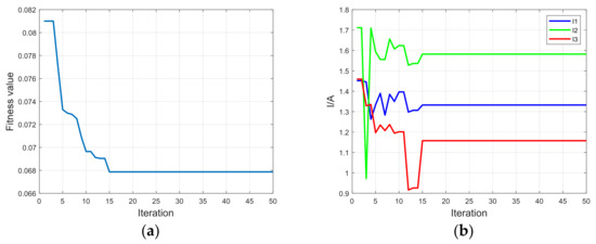 Three-stage constant current charging strategy optimization curve: (a) fitness value curve; (b) phase current value curve.