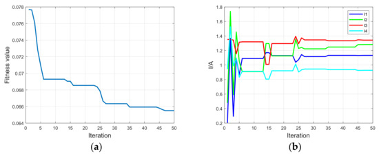 Four-stage constant current charging strategy optimization curve: (a) fitness value curve; (b) phase current value curve.
