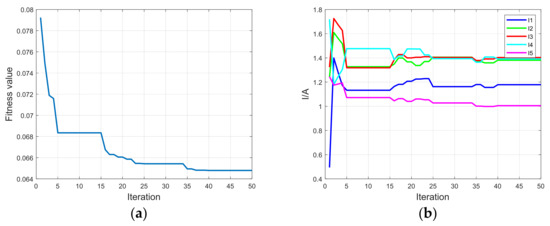 Five-stage constant current charging strategy optimization curve: (a) fitness value curve; (b) phase current value curve.