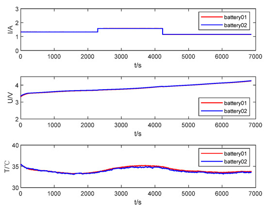 When establishing the model, first, according to the current I and voltage U of the input model, the parameter values , , , , and , etc. of the circuit model are calculated by the parameter identification method. Second, the current heat production, heat dissipation and temperature state of the lithium-ion battery are calculated based on the impedance parameters of the circuit model.