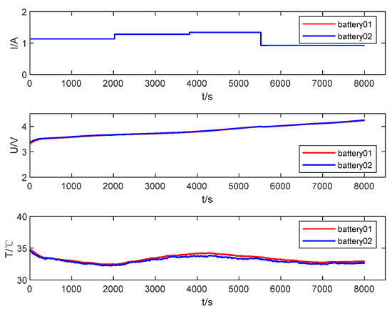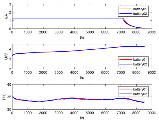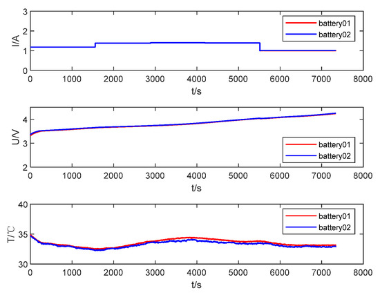 Figure 14, Figure 15 and Figure 16 above compare the current, voltage, and temperature curves during the charging process between the optimized charging strategy and the 0.5C CC-CV charging strategy of the two battery samples. The time required for the 0.5C CC-CV charging strategy of the two battery samples was 8551 s and 8490 s, respectively, and the four-stage optimized charging strategy with the longest time had an average time reduction of 6.13% compared with the 0.5C CC-CV charging strategy. It can be found from Figure 16 that the highest temperatures during the charging process with 0.5C CC-CV charging reached 34.61 °C and 34.52 °C, which were 1.65 °C and 1.62 °C higher than the lowest temperatures of 32.96 °C and 32.9 °C, respectively. The proposed five-stage constant current charging method not only had an average maximum temperature of 34.28 °C lower than the maximum temperature in 0.5C CC-CV charging but also reduced the charging time by an average of 13.87%. Therefore, the five-stage constant current charging strategy proposed in this paper has obvious advantages in shortening the charging time and reducing the temperature rise.