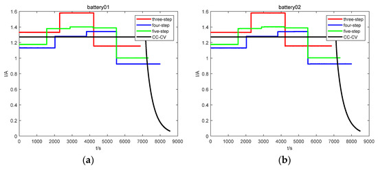 Current comparison diagrams between the optimized charging strategy and the constant current-constant voltage charging strategy: (a) Battery01; (b) Battery02.