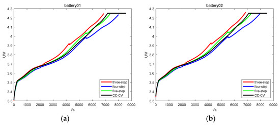 Voltage comparison diagrams between the optimized charging strategy and the constant current-constant voltage charging strategy: (a) Battery01; (b) Battery02.