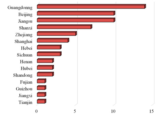 In terms of the geographical distribution, the LVDC projects are mainly distributed in economically developed regions such as the Pearl River Delta region, the Yangtze River Delta region, Beijing, and Shanghai. Among them, Guangdong Province ranks first in the number of projects (Figure 4). This is because the low-carbon development guidelines of the Guangdong–Hong Kong–Macao Greater Bay area have brought more supportive policies to the LVDC projects. Beijing and Jiangsu Province are also forerunners of the LVDC pilot projects, each having 10 projects, including the laboratory buildings for research and the technology pilot demonstration projects. Shanxi Province spearheads the application of LVDC technology in towns and villages, including seven projects. Notably, apart from economically developed regions, there are relevant cases in other provinces, such as Hubei, Jiangxi, and Guizhou. This indicates that as a major low-carbon development path, LVDC technology has received recognition and support from more local governments and has become one of the key energy application technologies to achieve future carbon peaking and carbon neutrality goals.