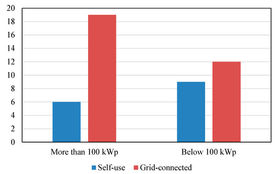 The main feature of LVDC buildings is the application of solar PV generation in buildings. Approximately 3~5% of the energy lost in conversion can be reduced because that LVDC system does not need an AC/DC converter in renewable access. Renewable generators can be integrated in an LVDC microgrid without too much consideration of impacts for grid stability. Hence, these projects follow the principle of maximizing the use of renewables—that is, installing solar PV panels on the available space, such as rooftops and facades of the buildings as much as possible. In terms of the project scale, there are 25 projects with a PV installed capacity of more than 100 kWp, accounting for 36.8% (Figure 5). Antuoshan Park of Huawei Digital Power Technology Co., Ltd. has a PV installed capacity of 2670 kWp, which is a MW level on-site PV project, with all PV panels installed on the rooftops and facades of buildings. It is worth mentioning that most projects with a PV installed capacity of more than 100 kWp connect to the power grid after generation, whereas projects with a PV installed capacity of less than 100 kWp use the power by themselves after generation. This is due to the mismatch between the load curve of the building and the PV generation. With economic factors taken into account, the projects with a larger PV capacity choose the operating strategy of grid connection.
