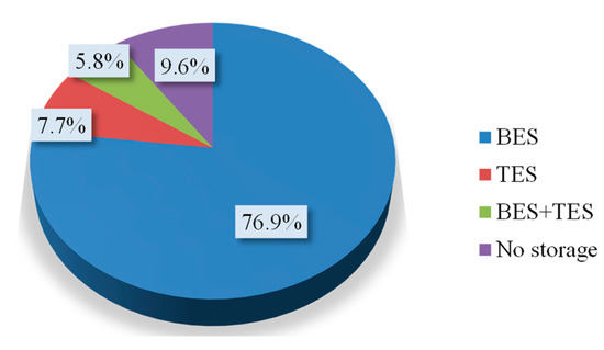 With the advancement of energy storage technology and over many years of verification of engineering applications, the application cases and technologies used for distributed energy storage have gradually increased [12,13]. In addition to thermal energy storage (TES), such as phase-change materials, water storage, and ice storage, electrochemical energy storage, represented by batteries, is also a commonly used solution for green buildings for energy conversation or increases to efficiency. Among all LVDC projects, more than 90% of the projects adopt demand-side energy storage, of which four projects use TES technology, and three projects concurrently use BES and TES as shown in Figure 6. The remaining 40 projects adopt BES. TES technology normally adopts the cool storage tank and air-conditioning refrigeration linkage pattern, which realizes cool storage by using the heat capacity at night in summer and release at peak periods of cooling [14]. The projects equipped with BES and TES technology have to address the optimization of energy distribution and the integrated control of the system, which are confronted with greater challenges in technology than other projects.