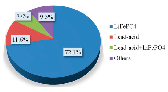 The battery types used in the electrochemical energy storage systems in these cases are distributed as shown in Figure 7. Approximately 3/4 of the projects use lithium iron phosphate batteries. This battery type possesses a clear advantage in the application of building energy storage. Featuring a long service life, high energy density, and good safety performance, LiFePO4 batteries are probably used more than any alternatives on a large scale in building energy storage. A total of 11.6% of the projects use lead–acid batteries. This battery is environmentally friendly and recoverable, enjoys high stability and security, and costs less than alternatives. However, lead–acid batteries will be phased out because its disadvantages, namely discharge rate and life cycle, which make the battery unable to meet the building energy storage requirements of high power and frequency. Sodium-ion batteries and lithium titanate batteries are also used. The safety precautions for electrochemical energy storage equipment are notable in actual LVDC projects. Additionally, the user-side energy storage environment should be kept controlled, and the risks of battery thermal runaway should be reduced along with reasonable battery management.