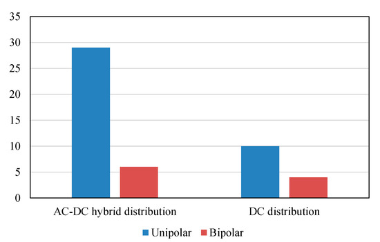 In terms of distribution mode, there are AC/DC hybrid distribution systems and global DC distribution systems. In terms of system topology, there are unipolar and bipolar structures [15]. The projects’ selection of distribution system structures is shown in Figure 8. A total of 35 projects chose to use the AC/DC hybrid distribution system, 2.5 times those which chose the DC distribution system (14 projects). The tendency to use the AC/DC hybrid distribution system is due to the DC distribution system being less mature than the AC distribution system now. At present, AC distribution is still necessary for some scenarios and electrical appliance applications, so the applicability of the AC/DC hybrid distribution system is higher than that of the DC distribution system. As for the selection of topology, the bipolar structure can get access to electric equipment with different powers (e.g., 750 V for air conditioner and 375 V for water heater) because it has more voltage classes than the unipolar structure, so it is more suitable for the full DC distribution system. However, as the bipolar structure has a more complex system and requires more difficult conservation and energy management technologies, unipolar structures are recommended in actual engineering. Most digital appliances, like mobile phones and PCs, use DC power directly. DC-driven LED lighting and air conditioners can be found on the market whereas GREE and Midea, famous electrical appliance manufacturers in China, are developing DC products. However, a clear distinction can be found in the LVDC system in application. For example, a DC system plug is different from that of the AC system, so users should be trained how to use such plugs. Protection technologies of DC are different so that new equipment such as breakers, residual-current devices (RCD), arc fault detection devices (AFDD), and insulation-monitoring devices (IMD), et al., with different functions should be developed.