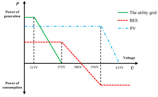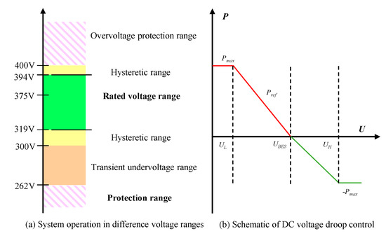 A typical DC voltage droop control method is shown as Figure 9a, the DC rated voltage is set to 375 V and fluctuates between 319 V (85% of rated voltage) and 394 V (105% of rated voltage) without affecting the use of electrical appliances. If the voltage continues to rise to 400 V, or drop to 300 V, it will reach a hysteresis zone where appliances can still work. Only when these two limits are exceeded, under-voltage and over-voltage protection will be triggered. Therefore, the DC power distribution control can regulate the system energy based on the characteristics of a wide, working voltage band and a converter’s voltage droop curve. Figure 9b shows the voltage droop control curve of a typical bi-directional DC/DC converter which outputs power varies with bus voltage. When the bus voltage is lower than UL, the converter operates with maximum output power Pmax. The converter’s output power Pref will decrease as the voltage increases to UBES. Then, the converter turns to charge with increasing power and reaches to maximum (Pmax) when voltage rises to UH.