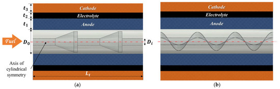 Schematic of micro-tubular solid oxide fuel cells with (a) cone-insert and (b) helical screw insert.