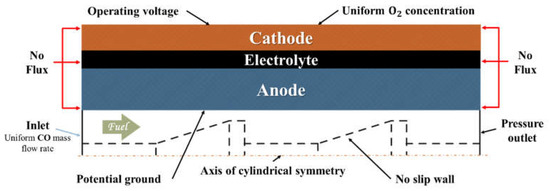The boundary conditions applied to the micro-tubular solid oxide fuel cells are illustrated in Figure 2. We applied a uniform O2 concentration to the outer surface of the porous cathode, a uniform CO mass flow rate at the fuel inlet, and the ambient pressure at the fuel outlet. The CO mole fraction was fixed as 0.95 at the fuel inlet for all cases investigated. The operating potential was applied to the cathode surface, while the zero potential is applied to the anode surface. At the insert walls, we used a no-slip boundary condition. The temperature is assumed to be 800 ℃ everywhere in the SOFC. The carbon deposition inside the porous electrode is not considered in this simulation. Table 2 summarizes the parameters used in this study.