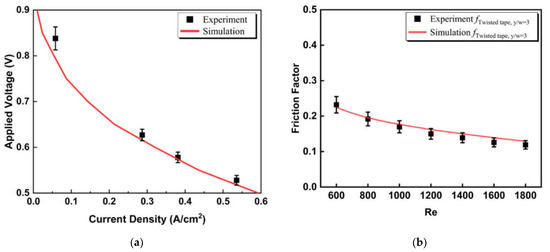 Experimental data from Mirahmadi’s study was used to validate the SOFC Multiphysics model [43]. The polarization curves generated from our simulation and those measured in their experimental data are shown in Figure 3a. Our simulated current density, measured at a given voltage, agrees well with the experimental results. The flow transport characteristics in the micro-tubular SOFC fuel channel were validated by comparing the friction factor as a function of the Reynolds number between our simulation and the experimental data from an earlier study [54]. The results indicate that our calculated friction factor matches well with the experimental data within 10% due to the experimental uncertainty reported, proving that the transfer process of the flow is properly simulated in our study.