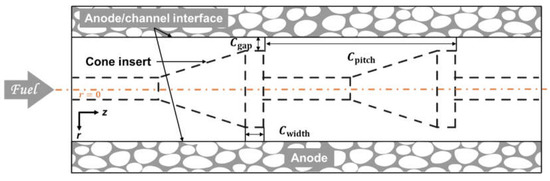 We first examined the effect of the radial flows on the mass transfer characteristics of fuel and the overall output power density of the micro-tubular SOFC. A cone-insert was applied to generate the flow in the radial direction, as illustrated in Figure 4. The effects of different gaps, widths, and pitches on the flow and mass transfer characteristics in fuel channels of micro-tubular SOFCs with cone-inserts were studied. The cone-insert gap, Cgap, is defined as the clearance between the cone-insert and the anode-fuel channel interface, while the width, Cwidth, is the thickness of the cone base and the pitch, Cpitch, is the distance between two successive cones.