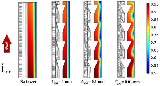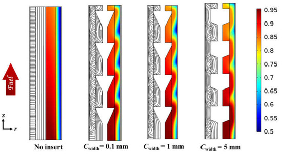 We initially examined the effect of cone-insert gap variation “Cgap” on flow and mass transfer characteristics in a micro-tubular SOFC. Figure 5 plots the predicted streamlines and CO mole fractions in the mid-plane throughout the central axis of the SOFC. The streamlines in the flow channel were parallel to the anode-fuel channel interface (z-direction) for the case without the insert. The streamlines within the anode were oriented radially, showing the direction of fuel diffusion. The streamlines exhibited tiny fluctuations at the corners of the cone-inserts for the case with a 1 mm gap, as illustrated in Figure 5. The influence of these fluctuations on fuel diffusion is negligible. As the gap was further decreased from 1 mm to 0.1 mm or 0.01 mm, the fuel was forced into the porous anodes, which significantly affects the fuel diffusion, as observed from the streamlines in the anodes.