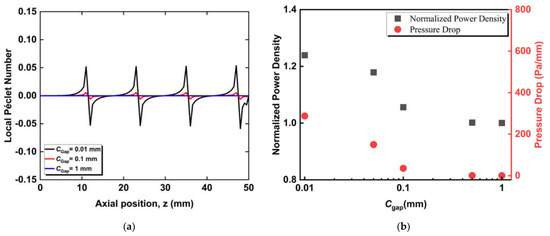 In this equation, ur is the characteristic velocity in the r-direction, rp is the effective pore radius, and Dcoco2,eff is the effective diffusion coefficient. Figure 6a compares the local Péclet numbers as a function of axial locations for the cases with gaps of 1 mm, 0.1 mm, and 0.01 mm. The local Péclet number for the no-insert case is at the order of magnitude of 10−5, indicating a small convective mass transfer at the anode-fuel channel interface. The case with a 1 mm gap is comparable to the no-insert case, showing insignificant peaks at the order of 10−5, which indicates a low r-direction velocity at the anode-fuel channel interface. This is in part because most of the fuel can flow through the 1 mm gap between the cone-insert and the anode-fuel channel interface instead of entering the anode. As the gap is decreased from 1 mm to 0.1 mm, the local Péclet number is increased, and it reaches the maximum value at the base of the cones, indicating that the fuel enters the anode pores at a relatively large r-direction velocity. The case with a 0.1 mm gap shows a maximum local Péclet number of 0.005. As the gap is further decreased to 0.01 mm, these peaks become significantly higher and wider, indicating that more fuel is delivered into the porous anode. The positive and negative peaks highlight that the fuel enters or leaves the anode, respectively. The local Péclet number peaks with a higher order of magnitude, indicating that convective and diffusive mass transfer of fuel in the radial direction are comparable at the anode-fuel channel interface. The convective mass transfer along the radial direction enables more fuel to reach the triple-phase boundaries and therefore has the potential to improve the SOFC power density.